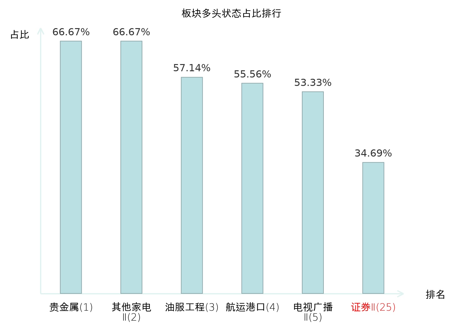 全市场所有行业板块中主力多头状态占比排名中,贵金属板块位居第一。医疗服务板块名次提升最快,较昨日上升68位。