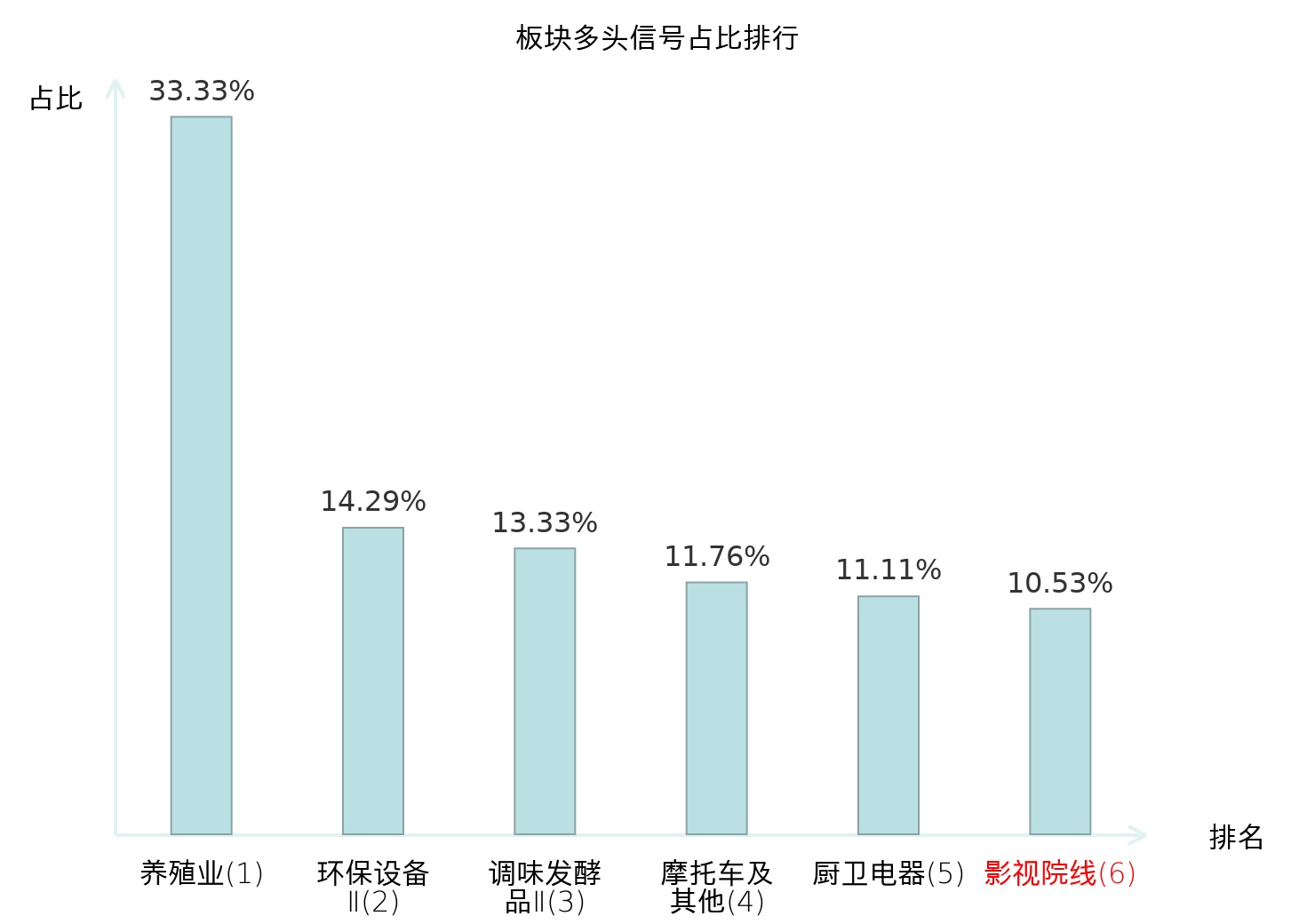 全市场所有行业板块中主力多头信号占比排名中,养殖业板块位居第一。厨卫电器板块名次提升最快,较昨日上升109位。