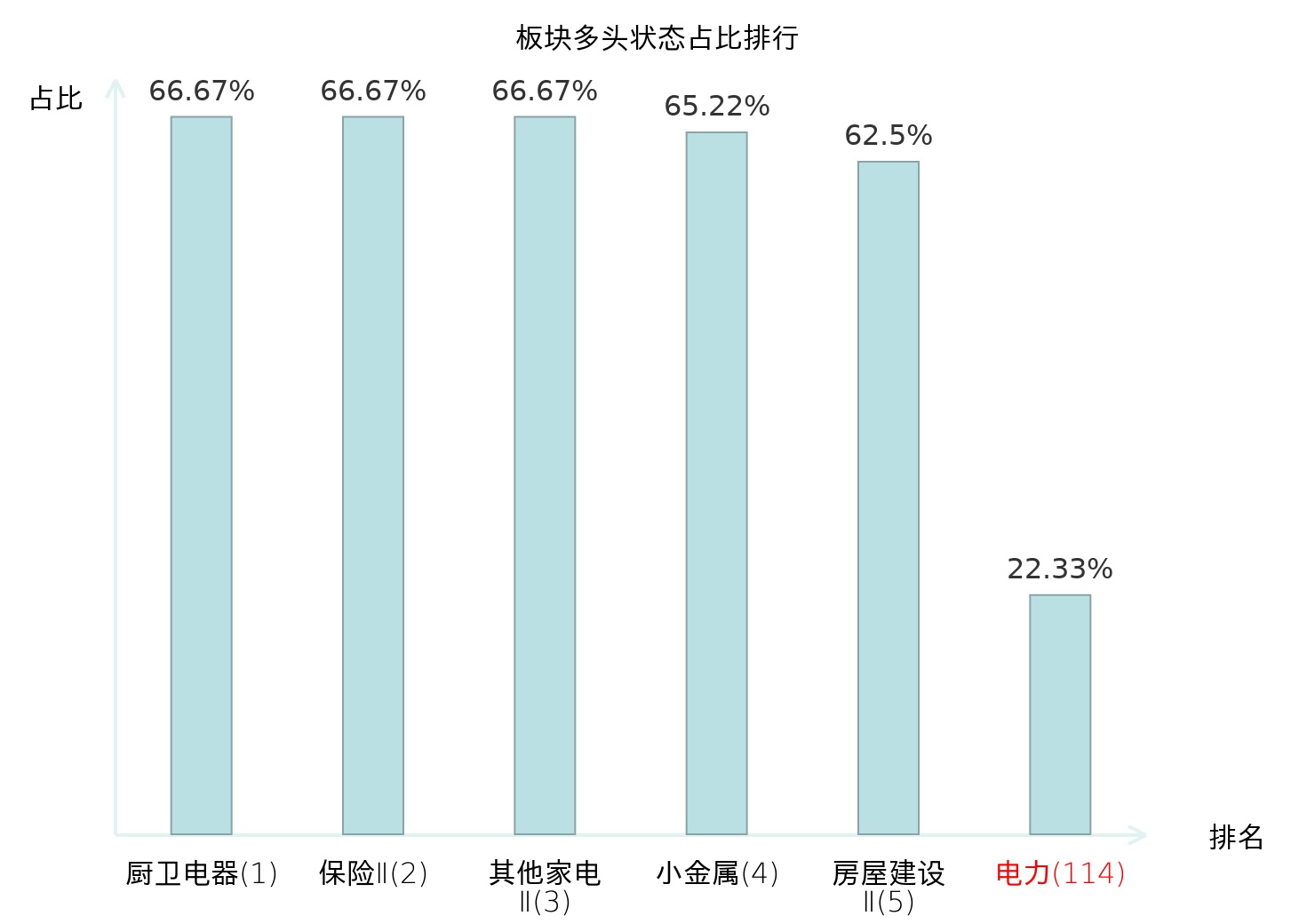 全市场所有行业板块中主力多头状态占比排名中,厨卫电器板块位居第一。乘用车板块名次提升最快,较昨日上升82位。