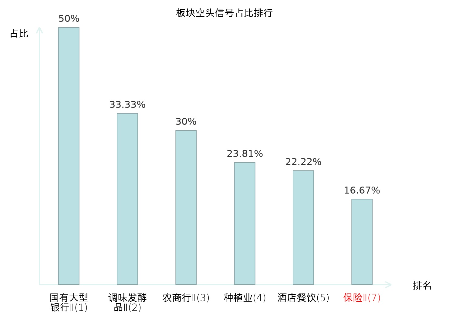 全市场所有行业板块中主力空头信号占比排名中,国有大型银行Ⅱ板块位居第一。半导体板块名次提升最快,较昨日上升94位。