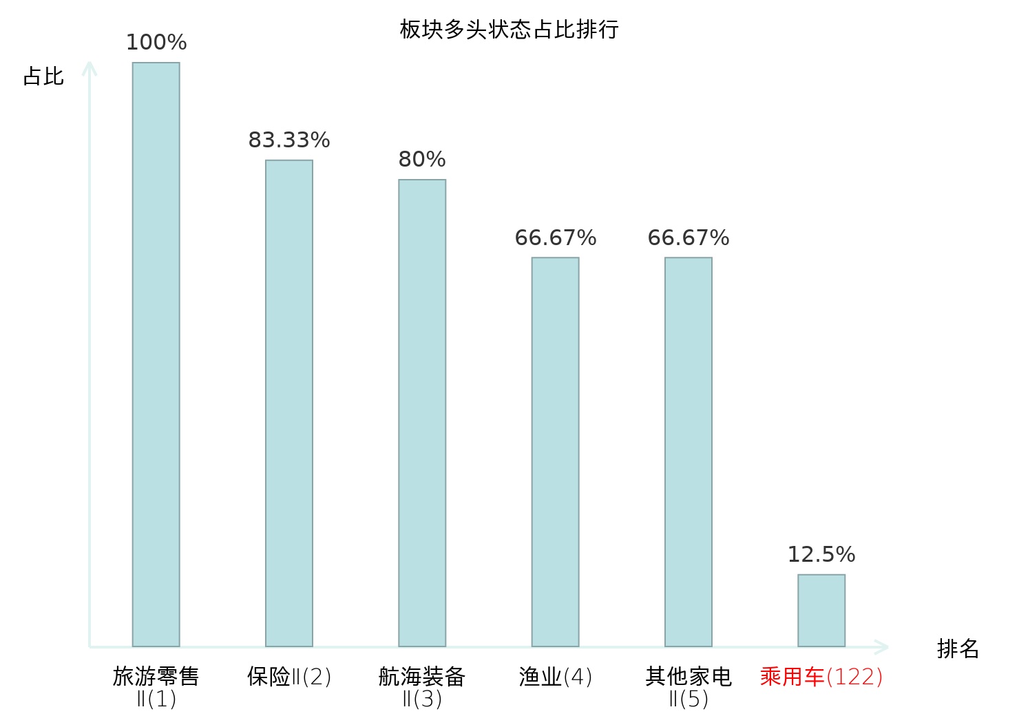 全市场所有行业板块中主力多头状态占比排名中,旅游零售Ⅱ板块位居第一。证券Ⅱ板块名次提升最快,较昨日上升106位。