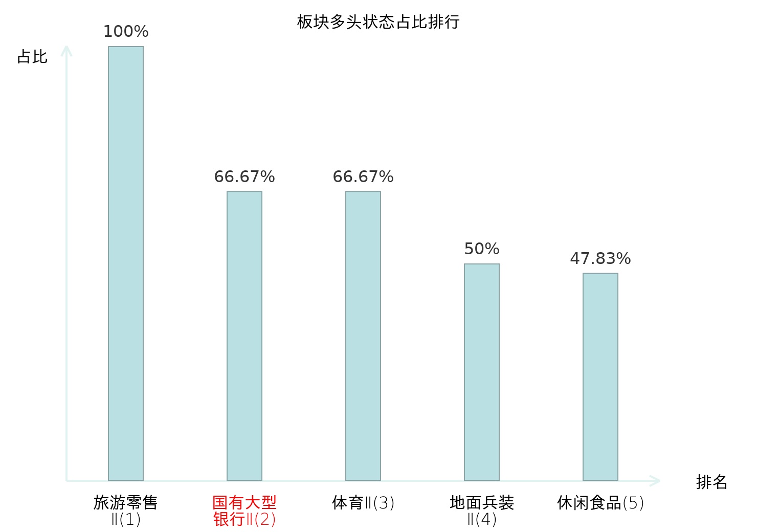 全市场所有行业板块中主力多头状态占比排名中,旅游零售Ⅱ板块位居第一。航空机场板块名次提升最快,较昨日上升80位。