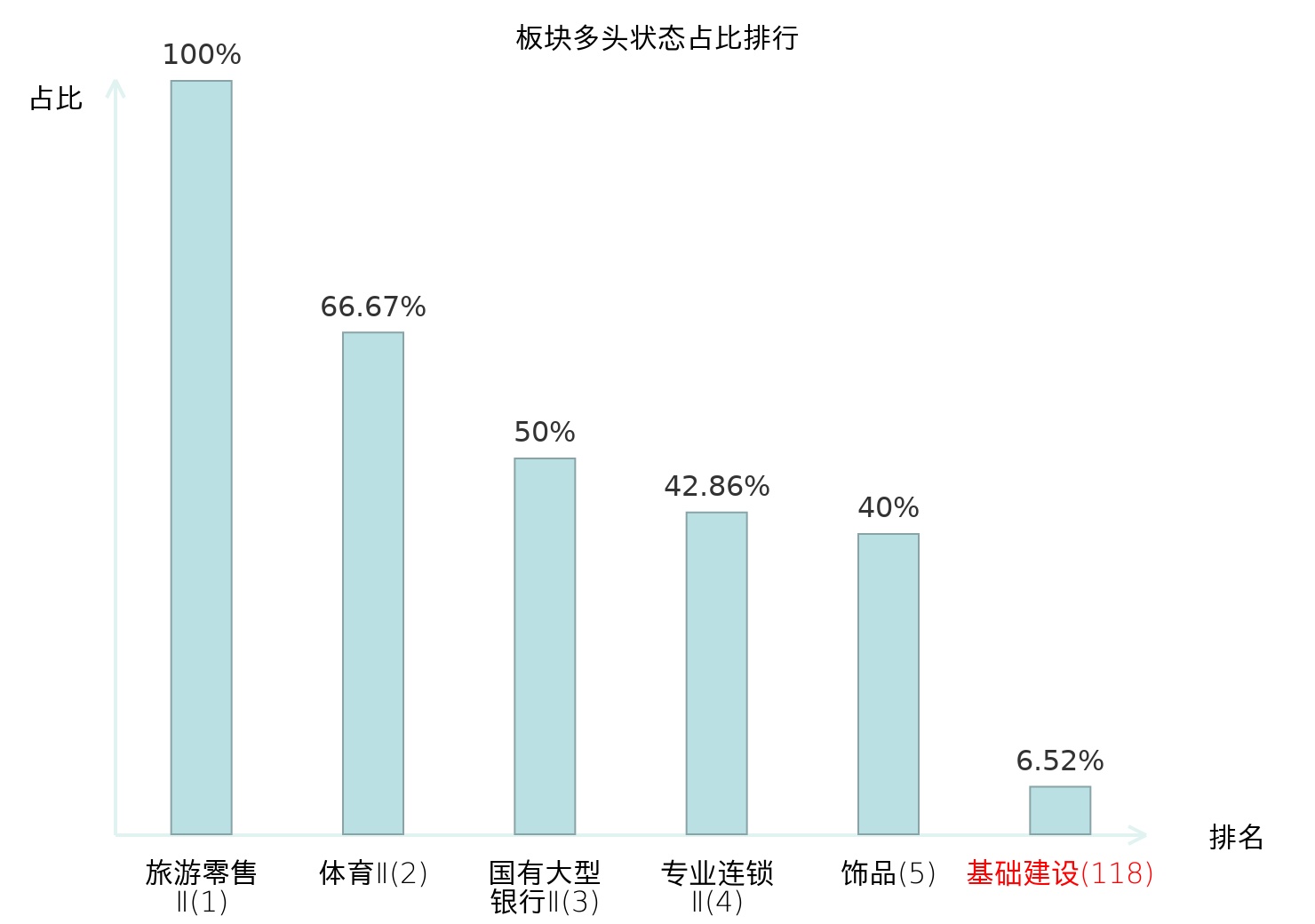 全市场所有行业板块中主力多头状态占比排名中,旅游零售Ⅱ板块位居第一。半导体板块名次提升最快,较昨日上升78位。