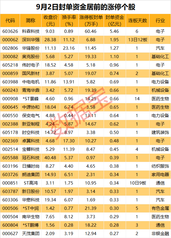 以封单金额计算,4股封单资金超亿元,科森科技、深圳华强、华锋股份封单资金居前,分别为5.46亿元、1.95亿元、1.27亿元。