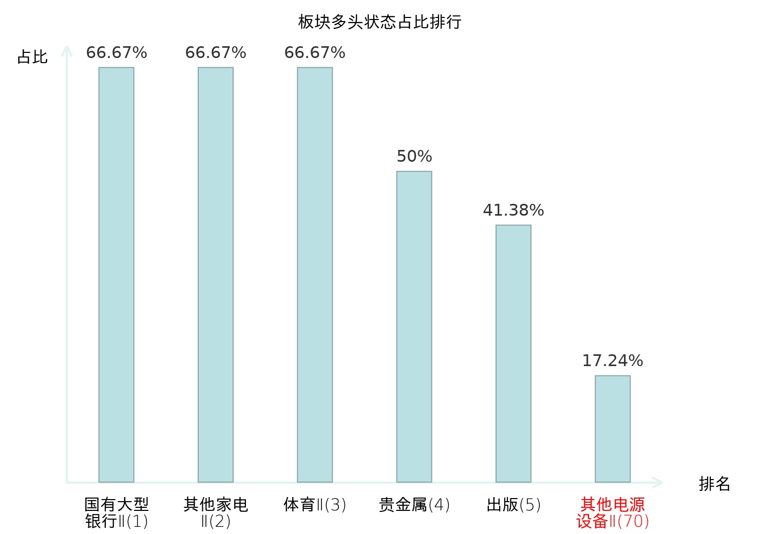全市场所有行业板块中主力多头状态占比排名中,国有大型银行Ⅱ板块位居第一。林业Ⅱ板块名次提升最快,较昨日上升96位。