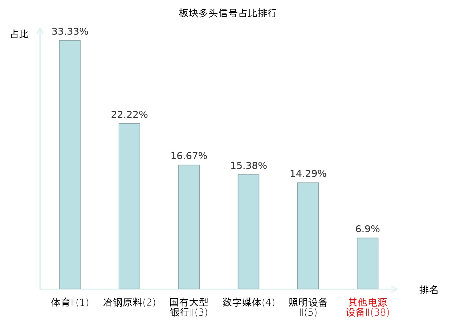 全市场所有行业板块中主力多头信号占比排名中,体育Ⅱ板块位居第一。体育Ⅱ板块名次提升最快,较昨日上升129位。