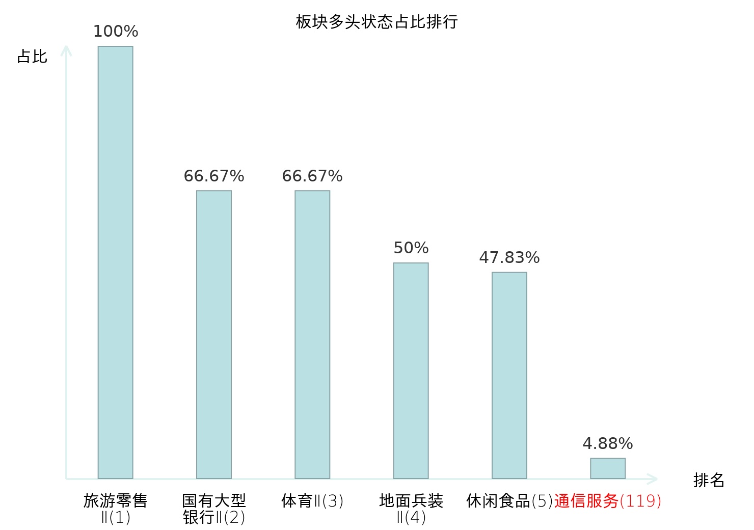 全市场所有行业板块中主力多头状态占比排名中,旅游零售Ⅱ板块位居第一。航空机场板块名次提升最快,较昨日上升80位。