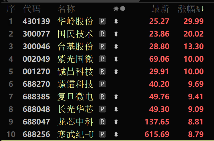 芯片概念股也全线走强,存储芯片、MCU芯片、汽车芯片、光刻机等细分板块均涨幅居前。华岭股份30%涨停,铖昌科技、紫光国微、鸿远电子等批量涨停。