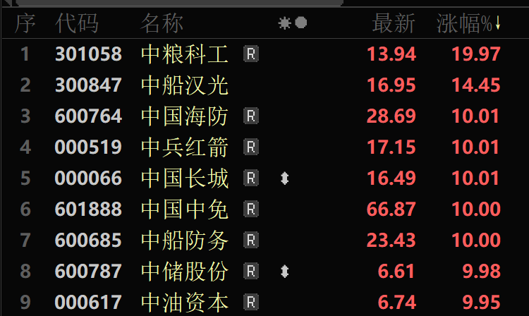 市场热点方面,中字头股今日集体上攻,板块指数大涨逾3%,创近半年来最大涨幅。中粮科工临近收盘直线拉升,20%涨停,中船应急亦20cm封板,中储股份、中国中免、中油资本等逾10股也强势涨停或涨超10%。