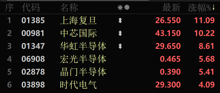 港股芯片股也跟随走强,恒生科技指数、港股通软件半导体指数强势上攻,上海复旦、中芯国际涨超10%,华虹半导体、晶门半导体、宏光半导体等涨幅居前。