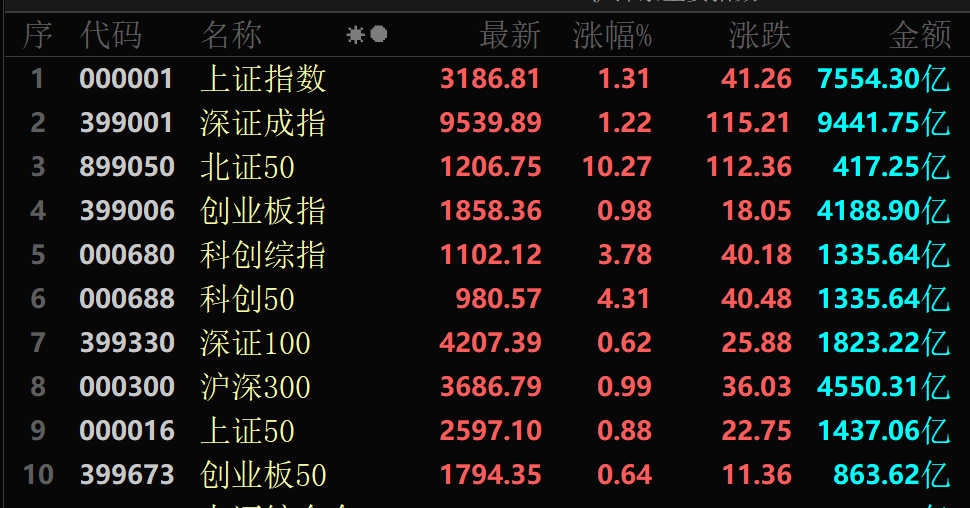科技成长股领涨,北证50指数飙升逾10%,科创50也大涨超4%,深证成指、上证指数午后也稳步拉升涨逾1%。值得注意的是,上证50指数临近收盘集合竞价的时候直线拉升。近4600只个股上涨,成交稳步放大至1.74万亿元。