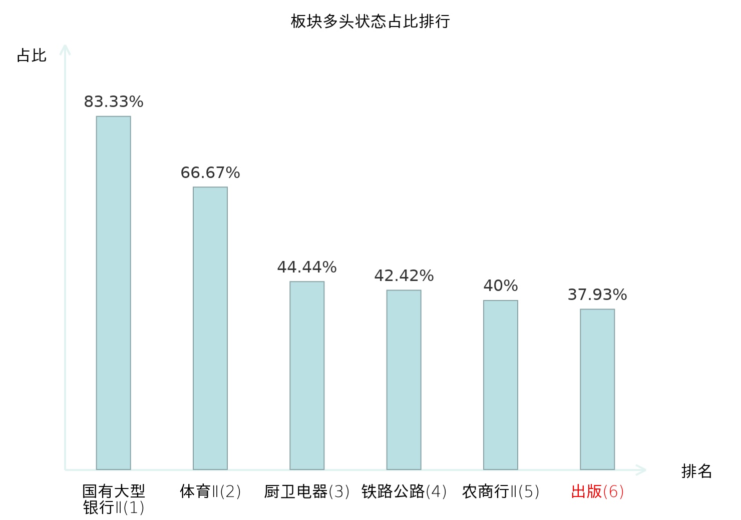 全市场所有行业板块中主力多头状态占比排名中,国有大型银行Ⅱ板块位居第一。包装印刷板块名次提升最快,较昨日上升30位。