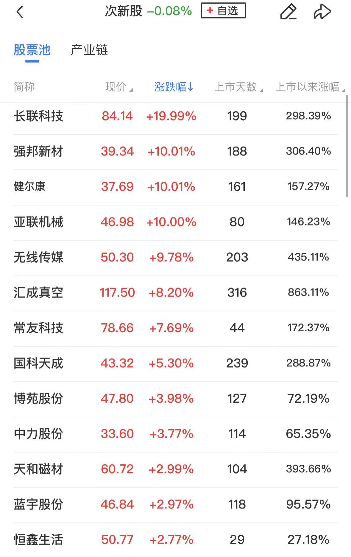 此外,次新股方向也逆势活跃,长联科技20CM涨停,健尔康、强邦新材、亚联机械涨停,汇成真空、常友科技、国科天成等个股涨幅居前。