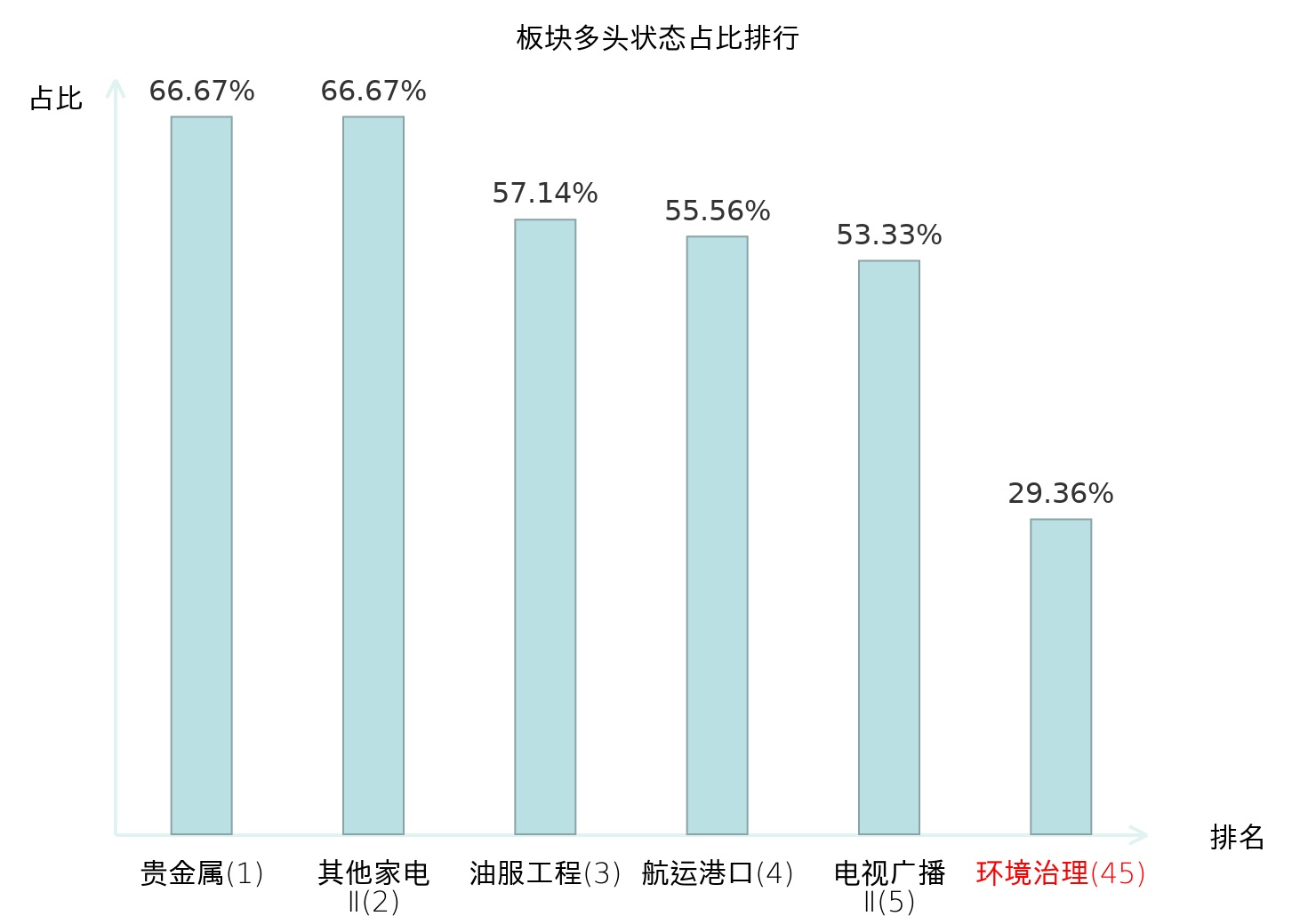 全市场所有行业板块中主力多头状态占比排名中,贵金属板块位居第一。医疗服务板块名次提升最快,较昨日上升68位。