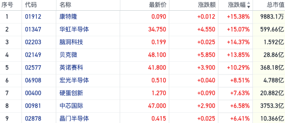 截至发稿,华虹半导体(01347.HK)涨超15%,英诺赛科(02577.HK)涨逾10%,中芯国际(00981.HK)、晶门半导体(02878.HK)等多只个股均跟涨6%以上。