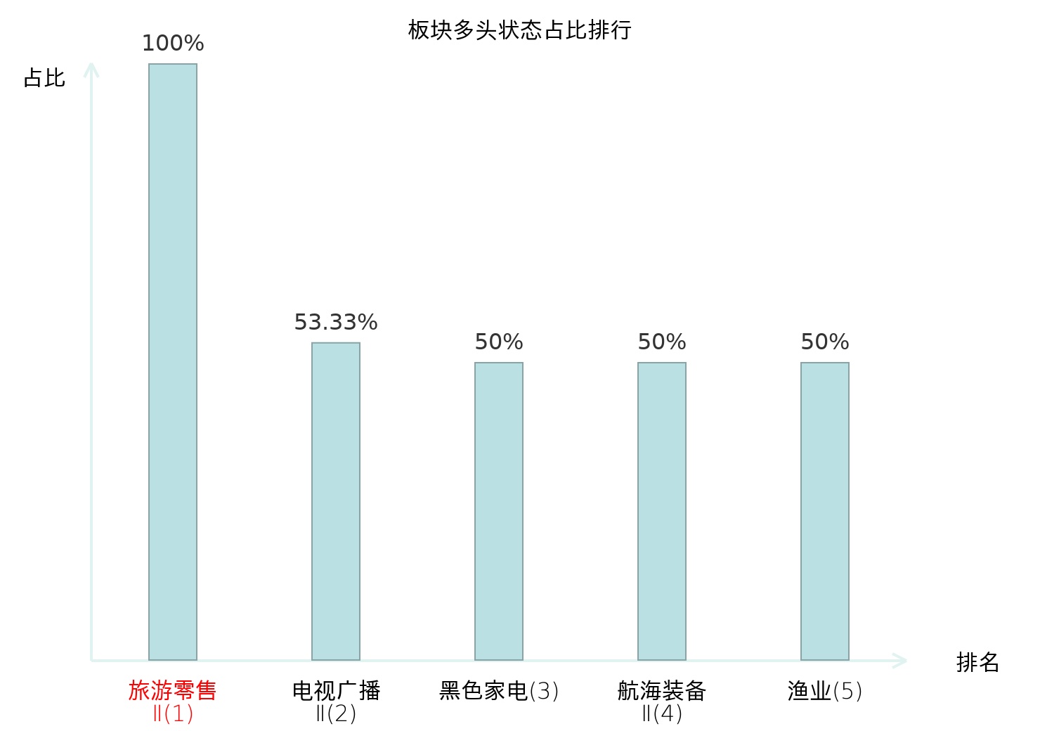 全市场所有行业板块中主力多头状态占比排名中,旅游零售Ⅱ板块位居第一。教育板块名次提升最快,较昨日上升98位。