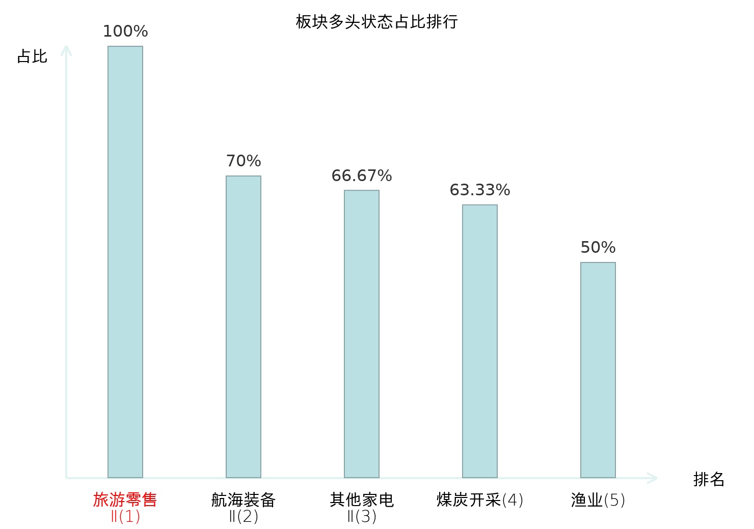 全市场所有行业板块中主力多头状态占比排名中,旅游零售Ⅱ板块位居第一。其他家电Ⅱ板块名次提升最快,较昨日上升127位。