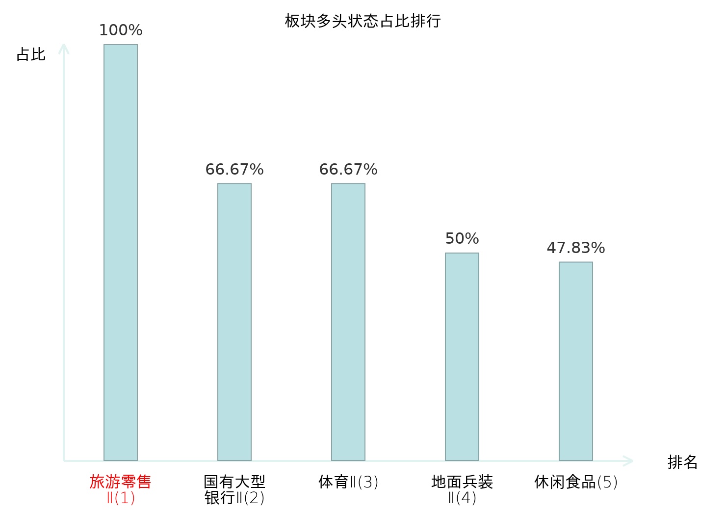全市场所有行业板块中主力多头状态占比排名中,旅游零售Ⅱ板块位居第一。航空机场板块名次提升最快,较昨日上升80位。