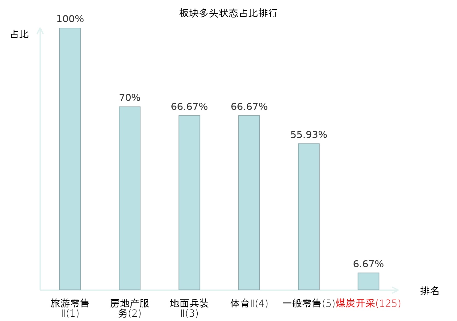 全市场所有行业板块中主力多头状态占比排名中,旅游零售Ⅱ板块位居第一。林业Ⅱ板块名次提升最快,较昨日上升68位。