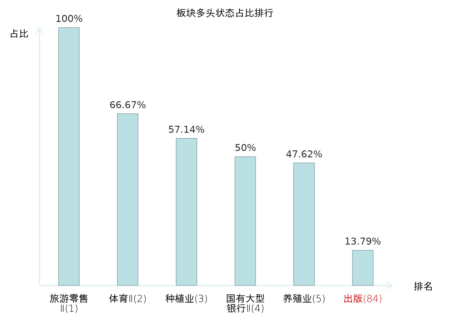 全市场所有行业板块中主力多头状态占比排名中,旅游零售Ⅱ板块位居第一。互联网电商板块名次提升最快,较昨日上升89位。