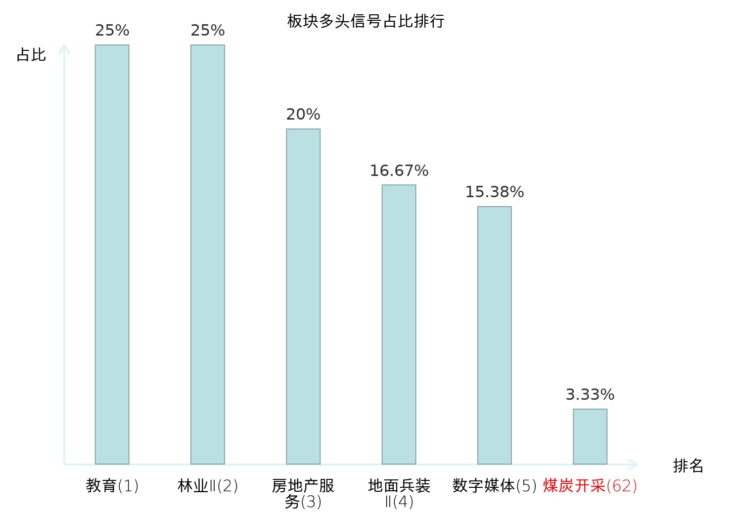 全市场所有行业板块中主力多头信号占比排名中,教育板块位居第一。林业Ⅱ板块名次提升最快,较昨日上升125位。