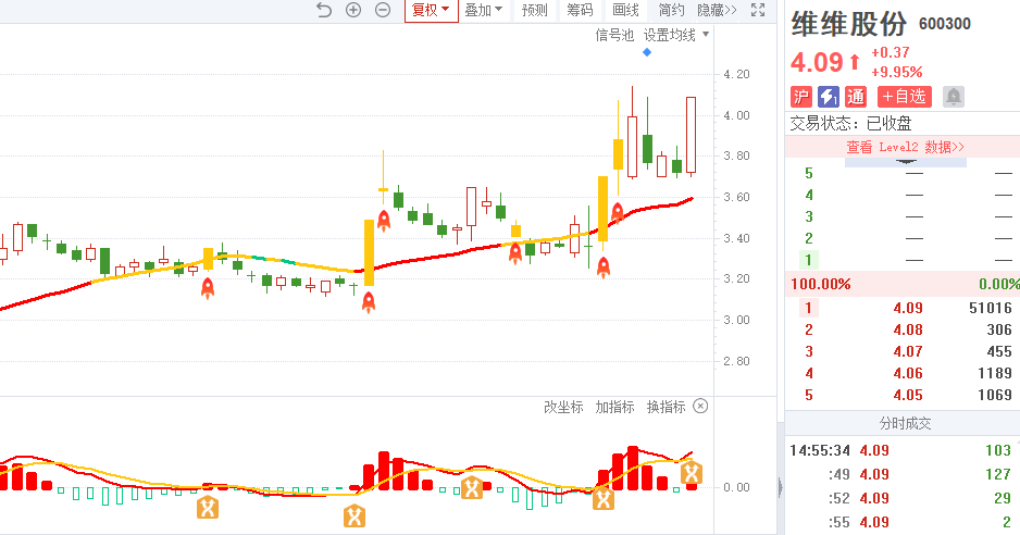 2)维维股份-四维操盘-近期出现火箭信号且底部量柱由绿转红