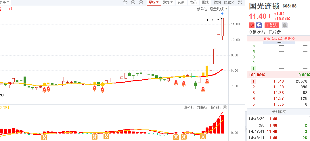 1)国光连锁-四维操盘-近期出现火箭信号且底部量柱由绿转红