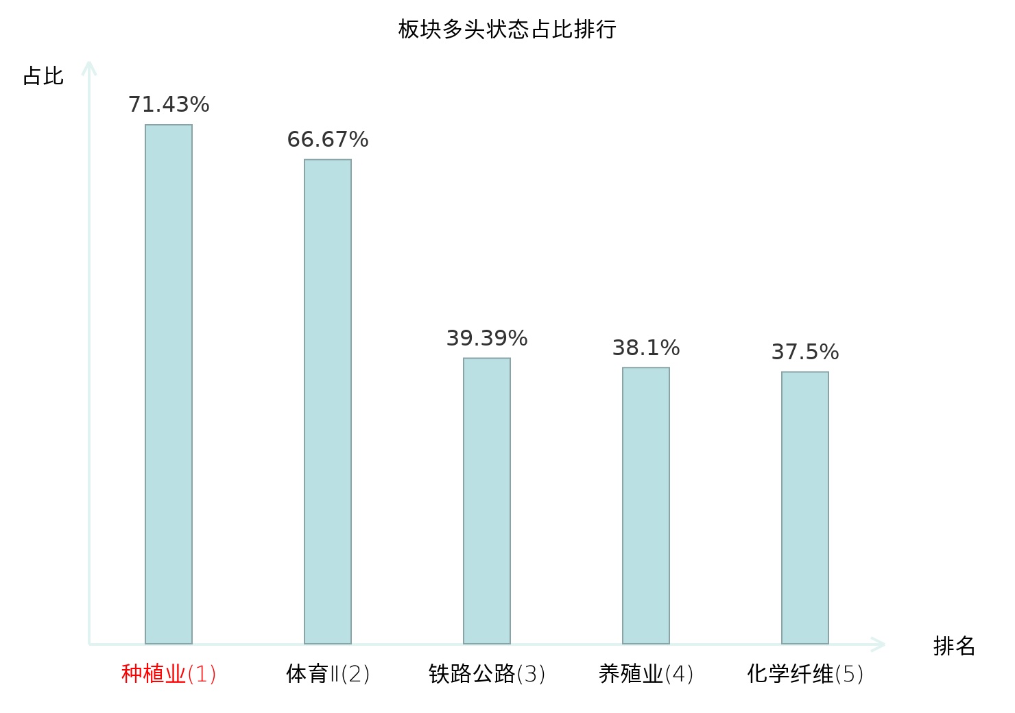 全市场所有行业板块中主力多头状态占比排名中,种植业板块位居第一。养殖业板块名次提升最快,较昨日上升99位。