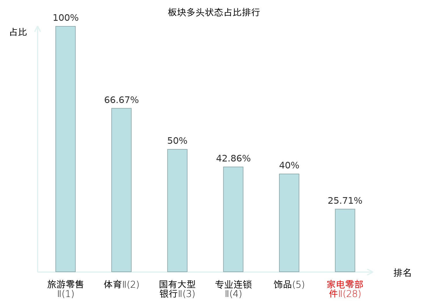 全市场所有行业板块中主力多头状态占比排名中,旅游零售Ⅱ板块位居第一。半导体板块名次提升最快,较昨日上升78位。
