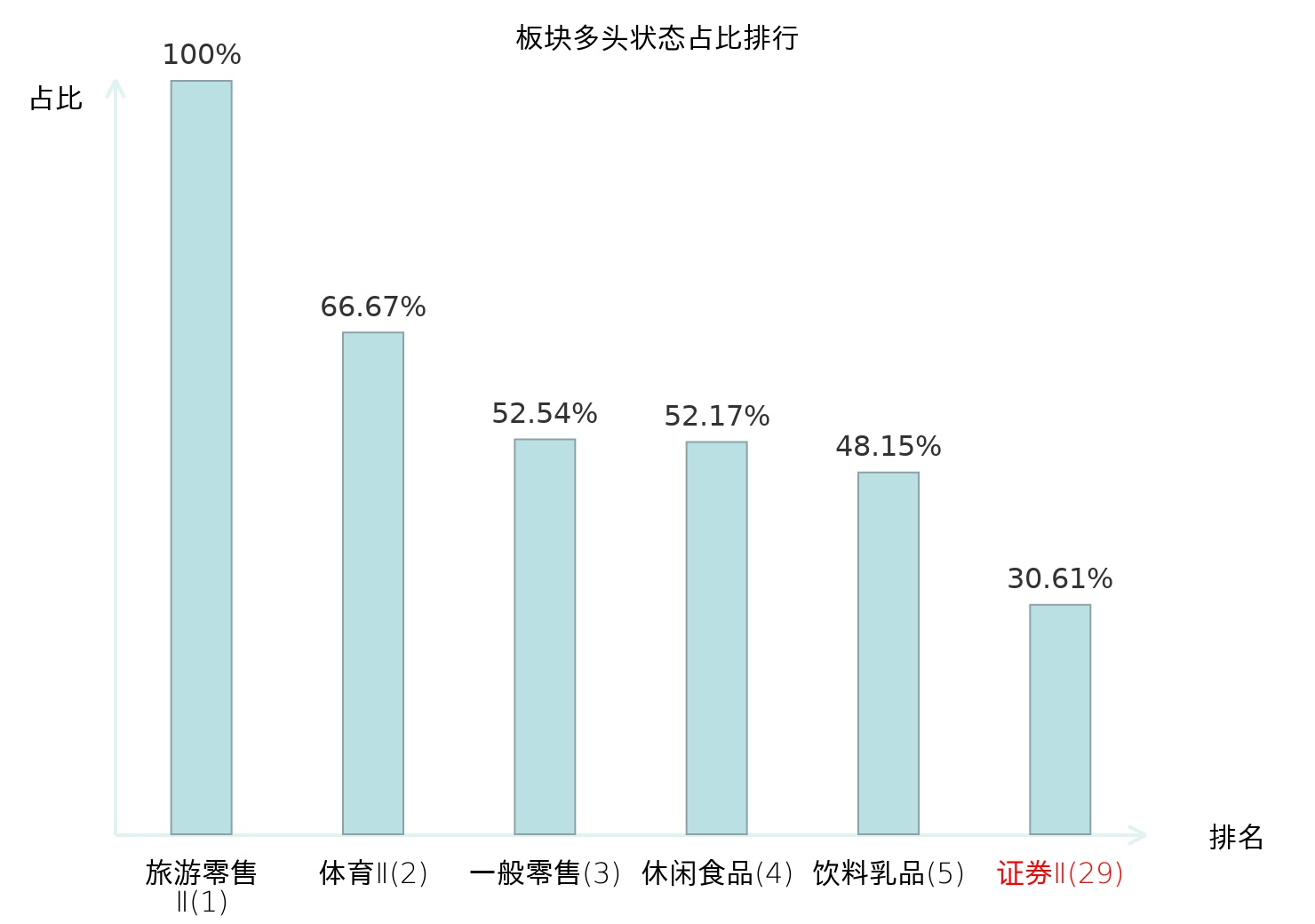 全市场所有行业板块中主力多头状态占比排名中,旅游零售Ⅱ板块位居第一。农业综合Ⅱ板块名次提升最快,较昨日上升109位。
