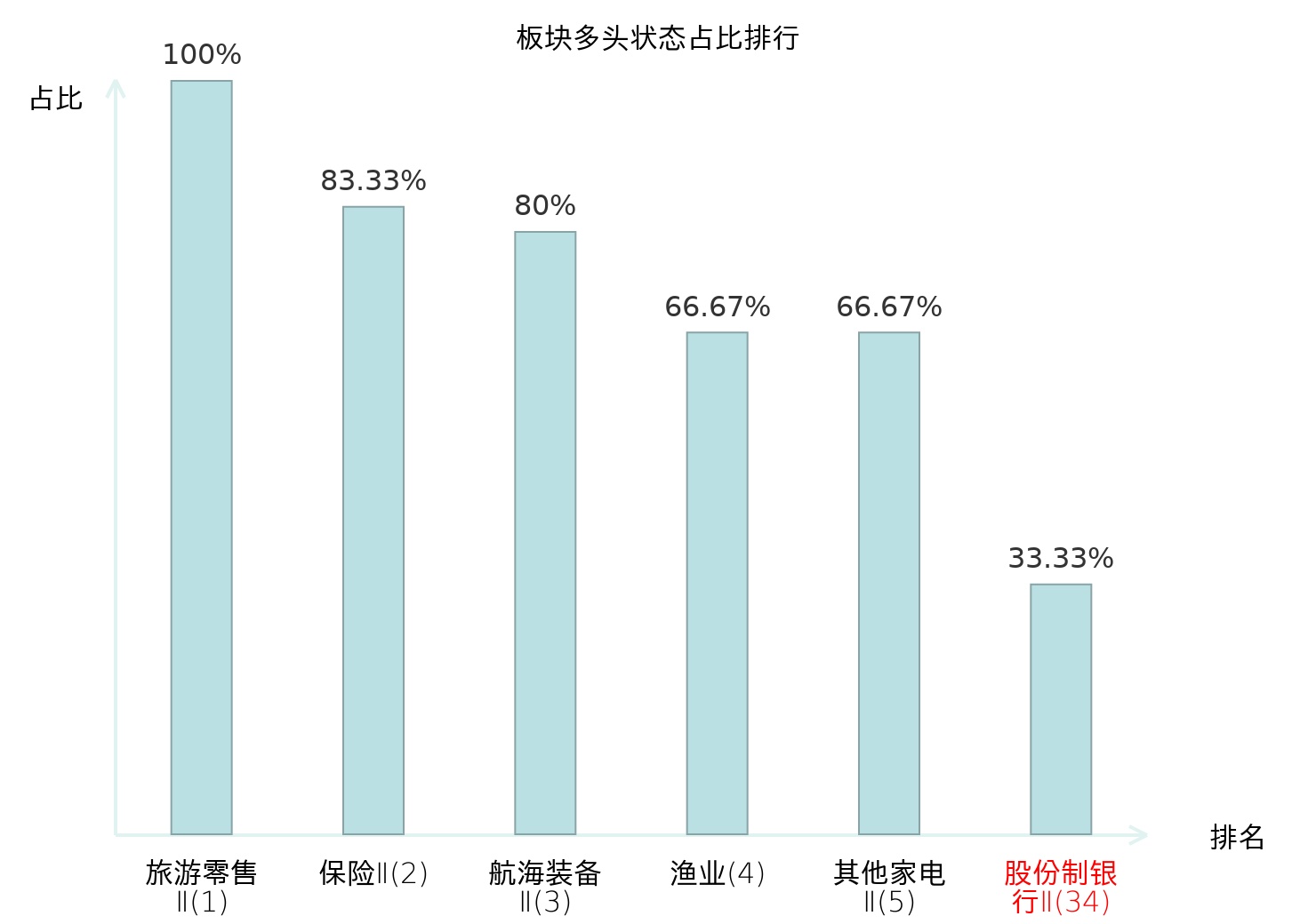 全市场所有行业板块中主力多头状态占比排名中,旅游零售Ⅱ板块位居第一。证券Ⅱ板块名次提升最快,较昨日上升106位。