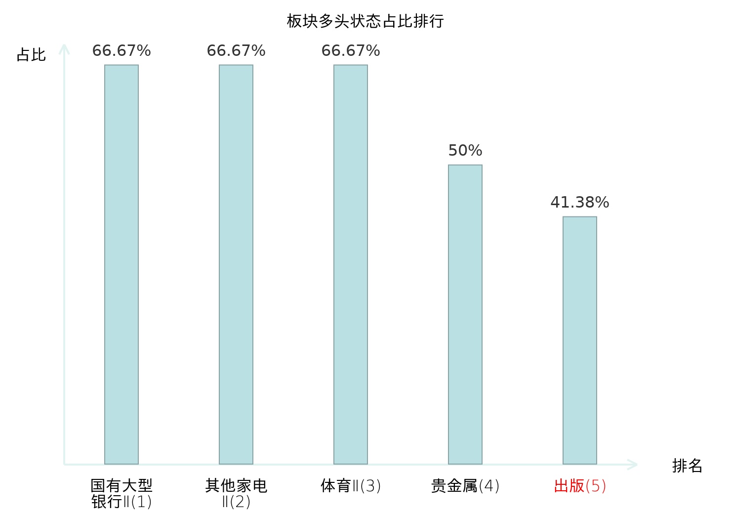 全市场所有行业板块中主力多头状态占比排名中,国有大型银行Ⅱ板块位居第一。林业Ⅱ板块名次提升最快,较昨日上升96位。