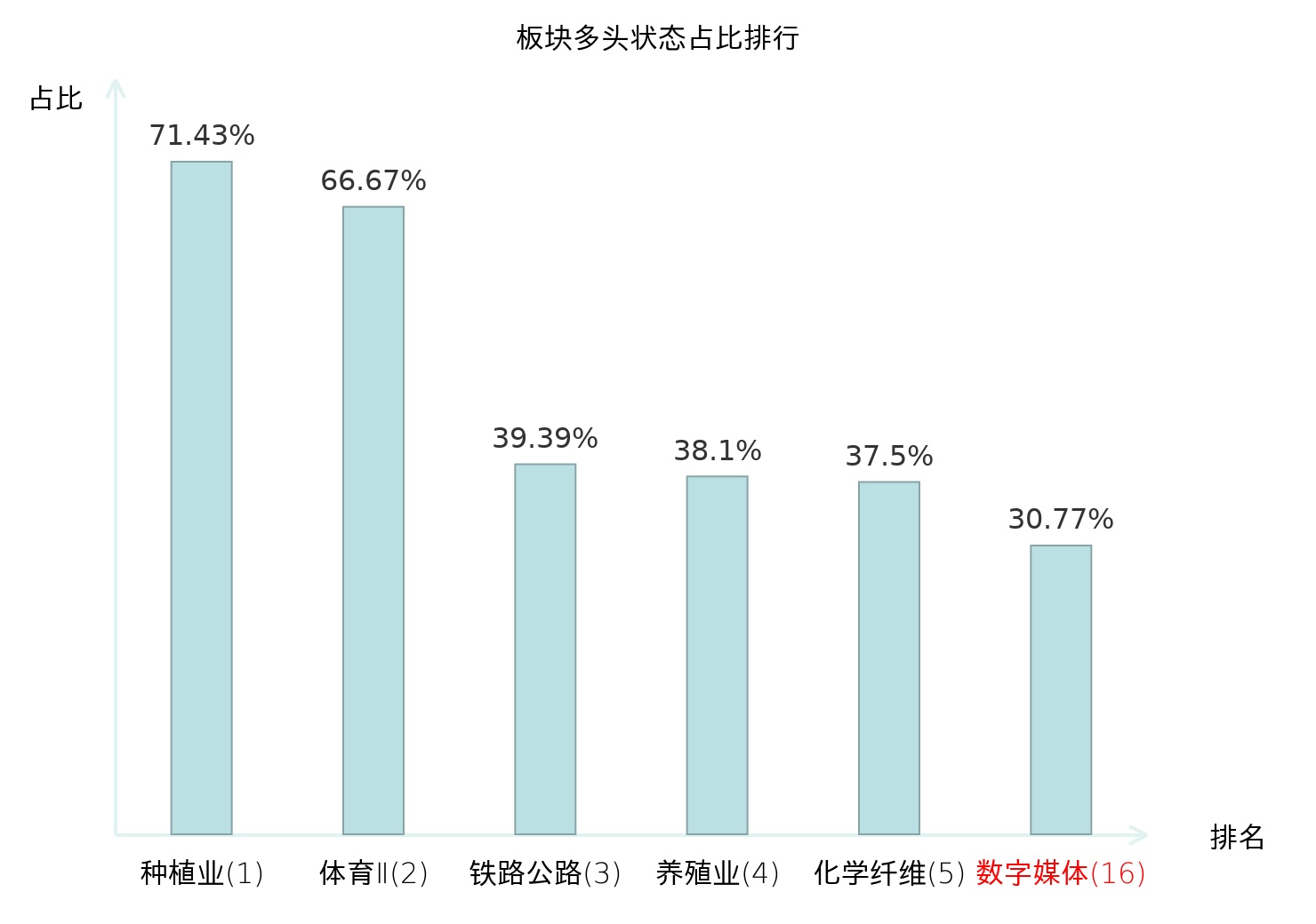 全市场所有行业板块中主力多头状态占比排名中,种植业板块位居第一。养殖业板块名次提升最快,较昨日上升99位。