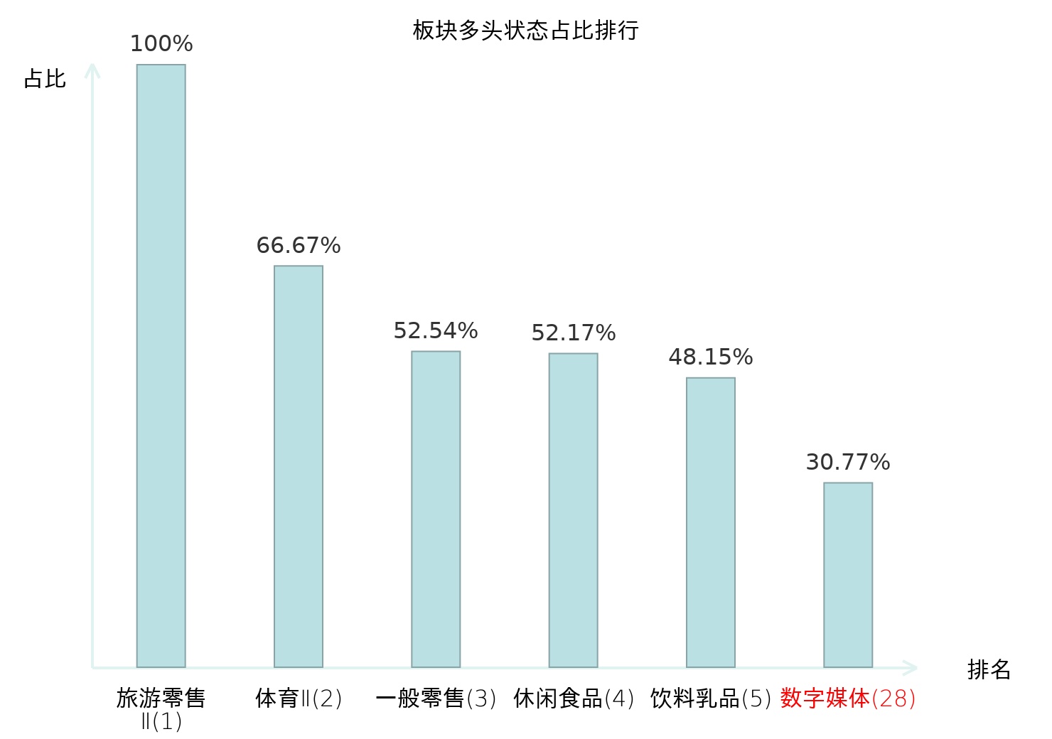全市场所有行业板块中主力多头状态占比排名中,旅游零售Ⅱ板块位居第一。农业综合Ⅱ板块名次提升最快,较昨日上升109位。