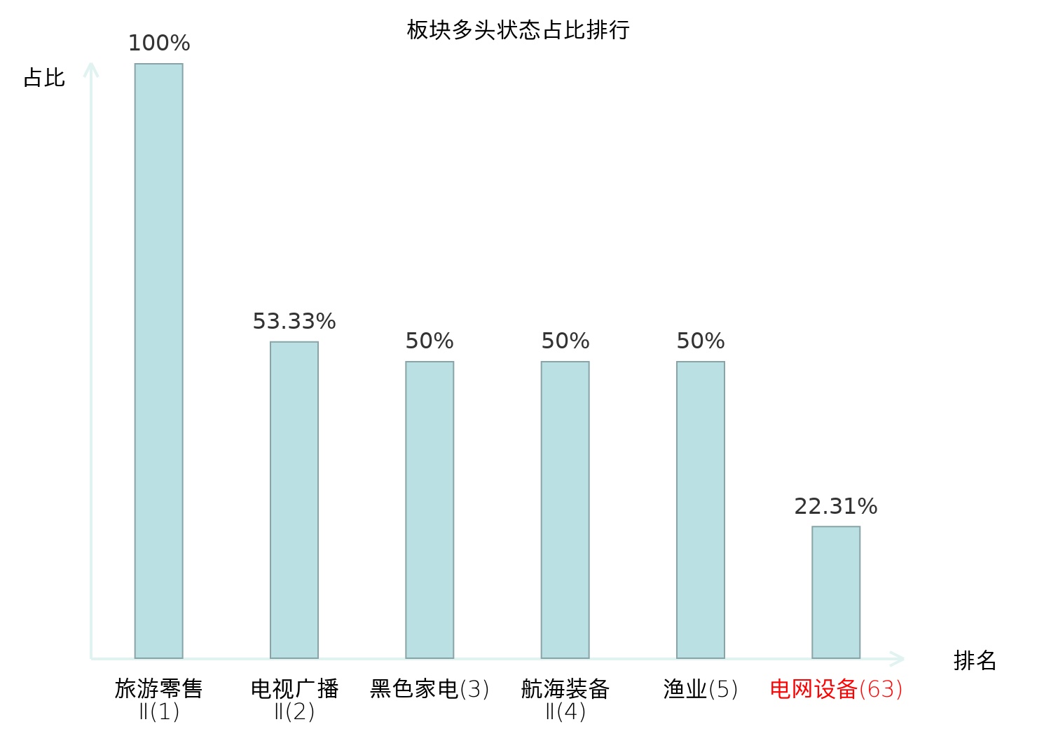 全市场所有行业板块中主力多头状态占比排名中,旅游零售Ⅱ板块位居第一。教育板块名次提升最快,较昨日上升98位。