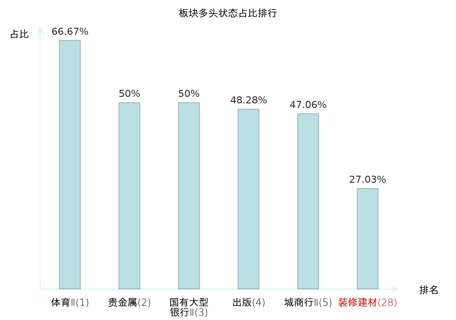 全市场所有行业板块中主力多头状态占比排名中,体育Ⅱ板块位居第一。电子化学品Ⅱ板块名次提升最快,较昨日上升78位。