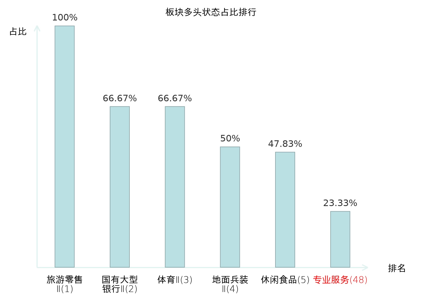 全市场所有行业板块中主力多头状态占比排名中,旅游零售Ⅱ板块位居第一。航空机场板块名次提升最快,较昨日上升80位。