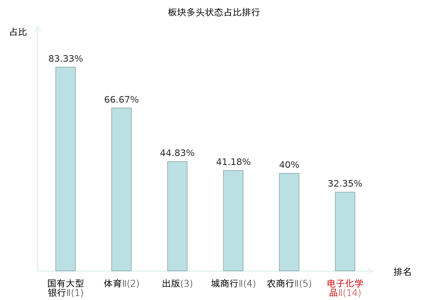 全市场所有行业板块中主力多头状态占比排名中,国有大型银行Ⅱ板块位居第一。焦炭Ⅱ板块名次提升最快,较昨日上升35位。
