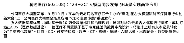 值得注意的是:2024年09月上海申银万国证券研究所的陈烨远/洪依真分析师,首次发布关于润达医疗的研究报告,标题为:润达医疗(603108):“2B+2C”大模型同步发布 多场景实现商业应用。