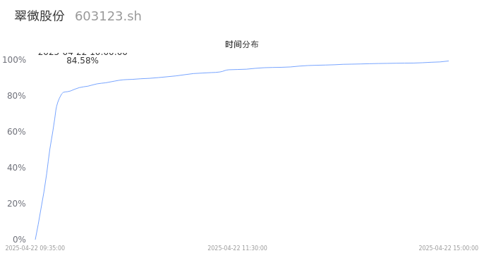 首先我们来看当日成交的时间分布。将今日交易时间按照5分钟的时间间隔进行切片,并绘制分布直方图进行观察。可以发现,10点之前的成交量占全天成交量的84.58%,这说明,该股票活跃时段换手火爆,资金热情高涨。