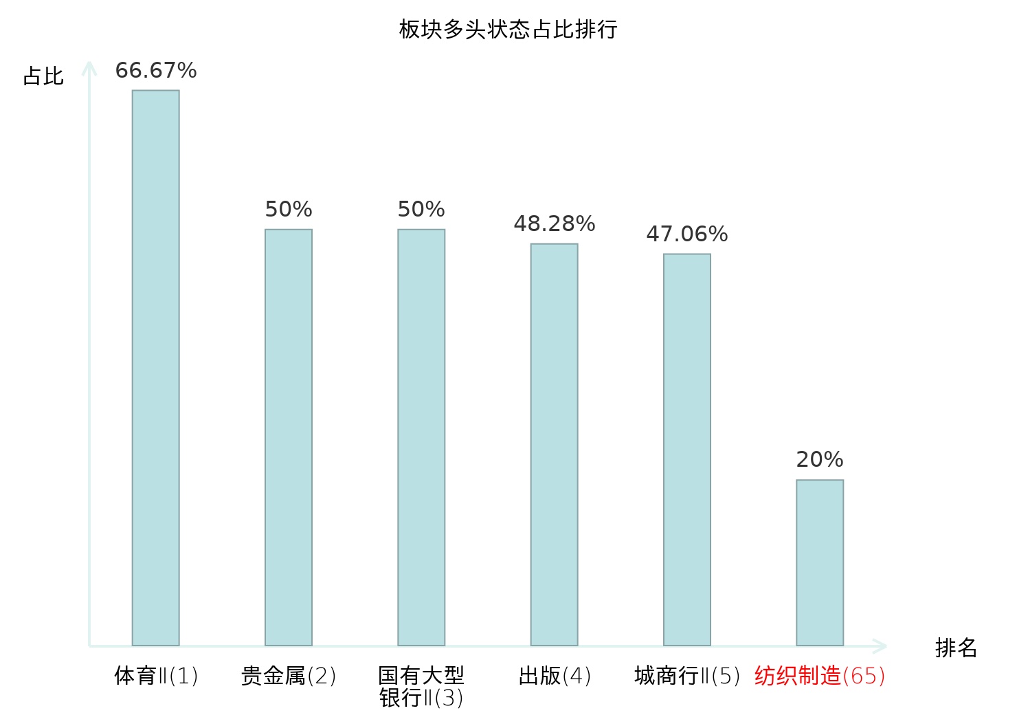 全市场所有行业板块中主力多头状态占比排名中,体育Ⅱ板块位居第一。电子化学品Ⅱ板块名次提升最快,较昨日上升78位。