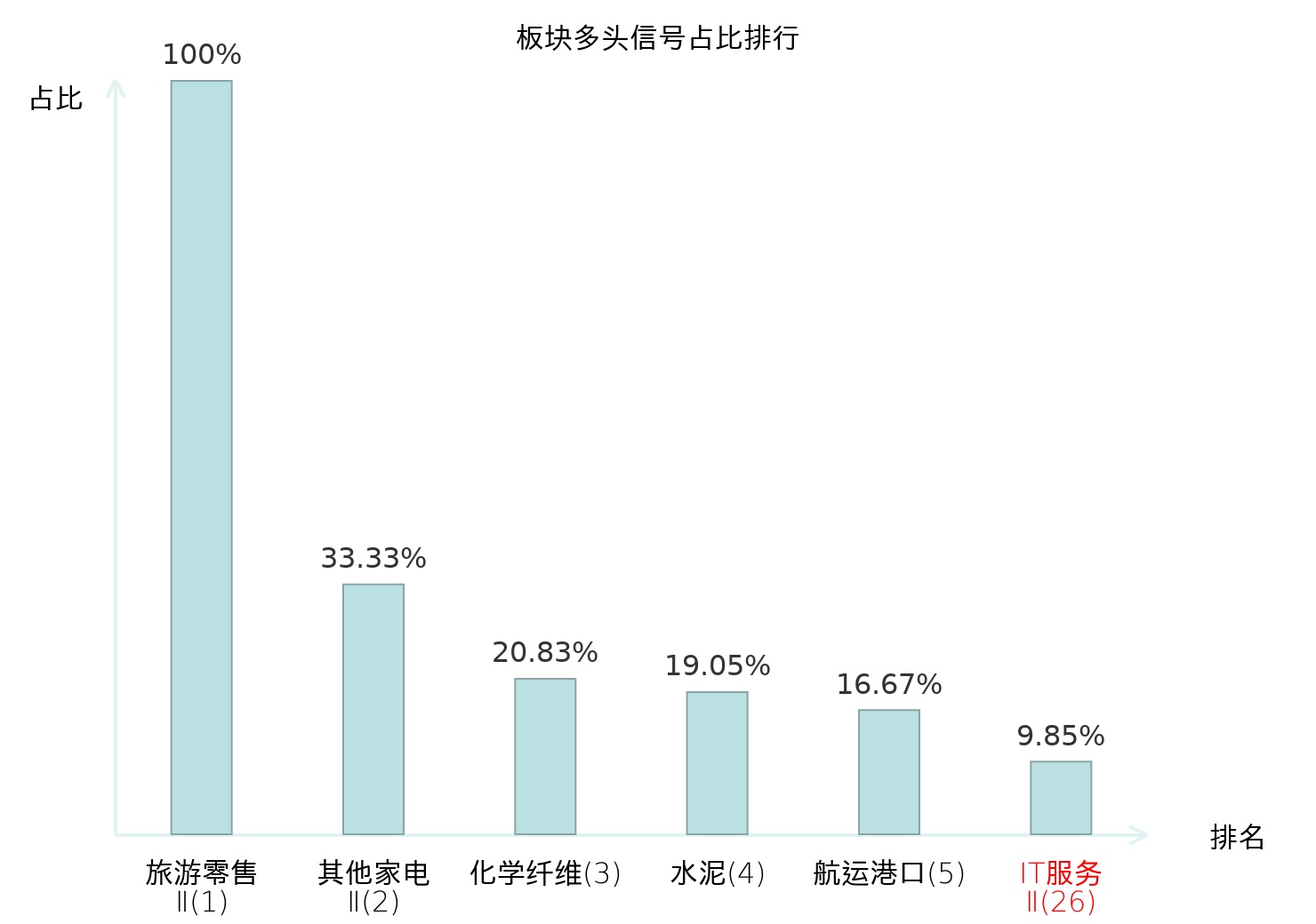 全市场所有行业板块中主力多头信号占比排名中,旅游零售Ⅱ板块位居第一。旅游零售Ⅱ板块名次提升最快,较昨日上升130位。