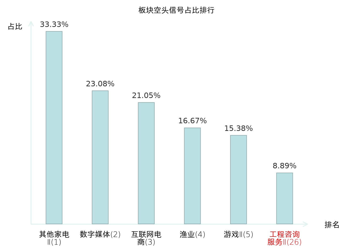 全市场所有行业板块中主力空头信号占比排名中,其他家电Ⅱ板块位居第一。化学纤维板块名次提升最快,较昨日上升103位。