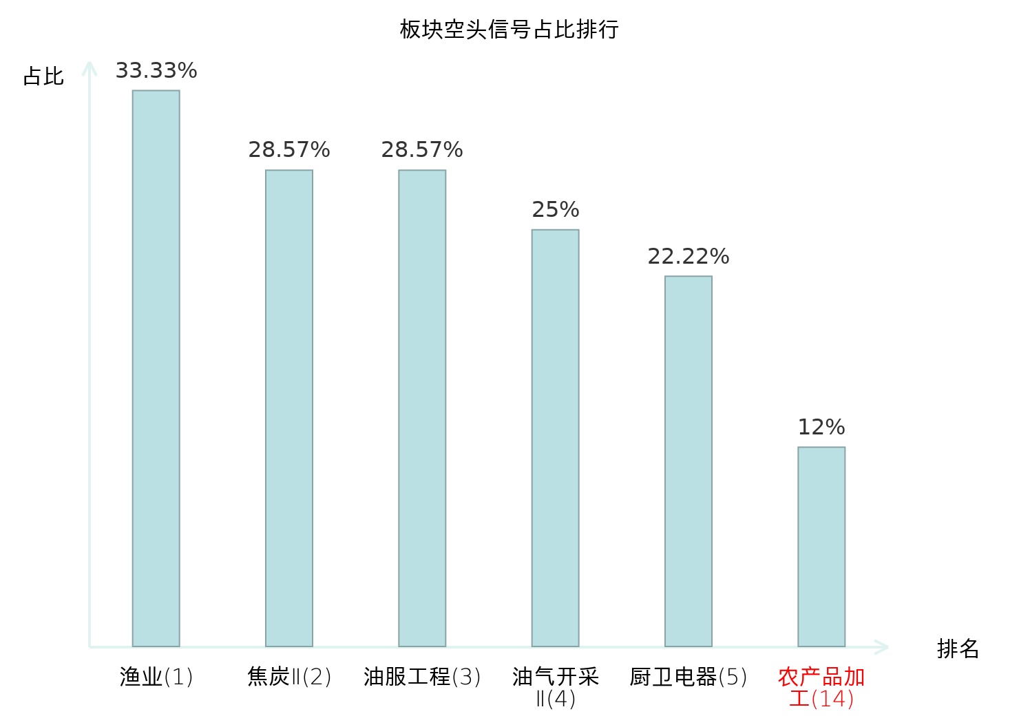 全市场所有行业板块中主力空头信号占比排名中,渔业板块位居第一。农产品加工板块名次提升最快,较昨日上升112位。