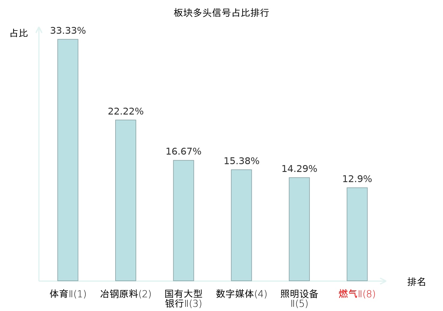 全市场所有行业板块中主力多头信号占比排名中,体育Ⅱ板块位居第一。体育Ⅱ板块名次提升最快,较昨日上升129位。