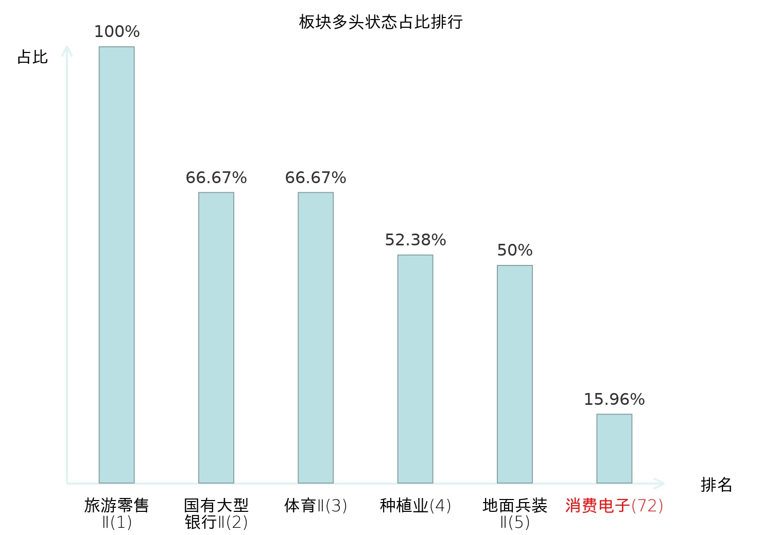全市场所有行业板块中主力多头状态占比排名中,旅游零售Ⅱ板块位居第一。股份制银行Ⅱ板块名次提升最快,较昨日上升54位。