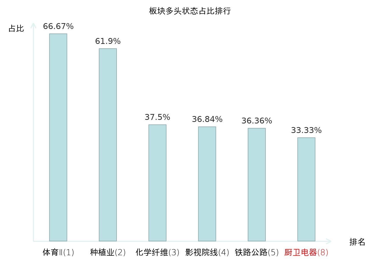 全市场所有行业板块中主力多头状态占比排名中,体育Ⅱ板块位居第一。种植业板块名次提升最快,较昨日上升65位。