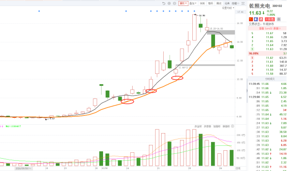 比如10月份的乾照光电,该股有注入芯片公司信芯微的预期,股价强度起来后,每一次回踩10日线,都成为股价再度起爆的关键点。10月24日,该股反弹过程中最后一次回踩5日线,略作整固后,边迎来三天两板的惊人表现。