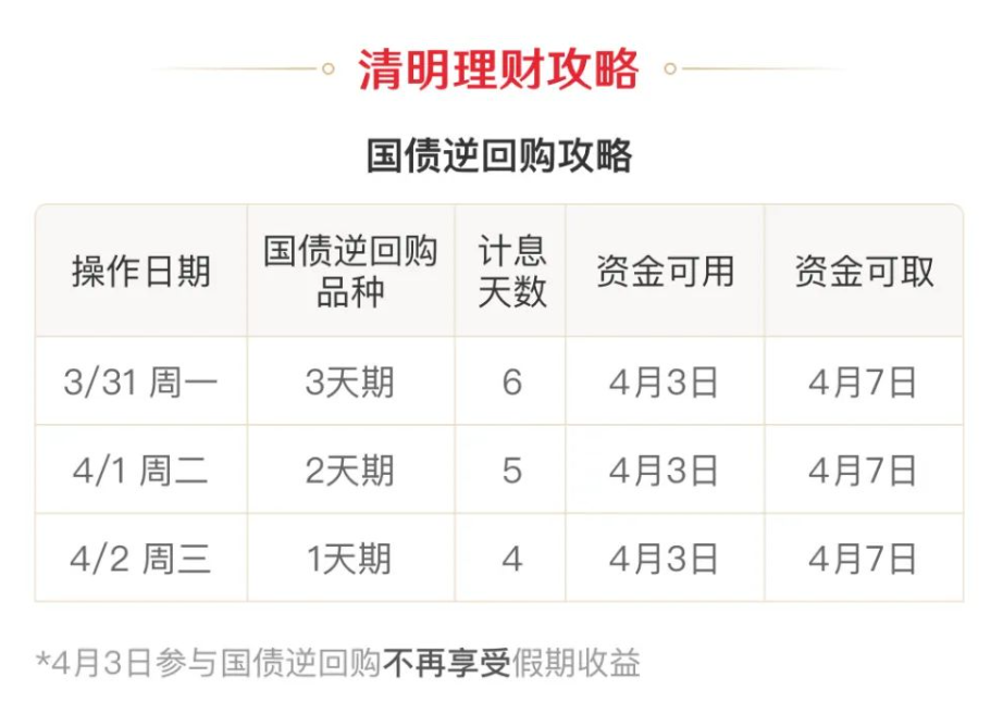 结合今年清明放假安排,本周三(4月2日)就是操作国债逆回购的最佳时点之一。4月2日当天,只需投资1天期逆回购就可以赚到4天的利息,而且资金在4月7日开盘前即可到账,也可取出。