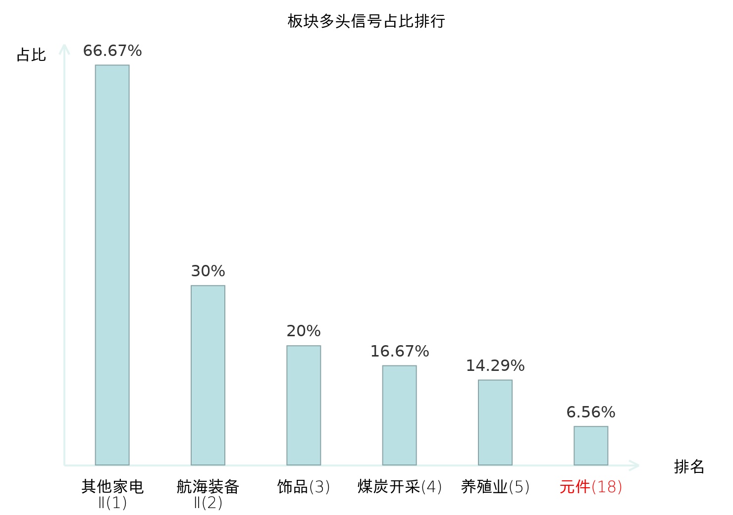 全市场所有行业板块中主力多头信号占比排名中,其他家电Ⅱ板块位居第一。其他家电Ⅱ板块名次提升最快,较昨日上升128位。